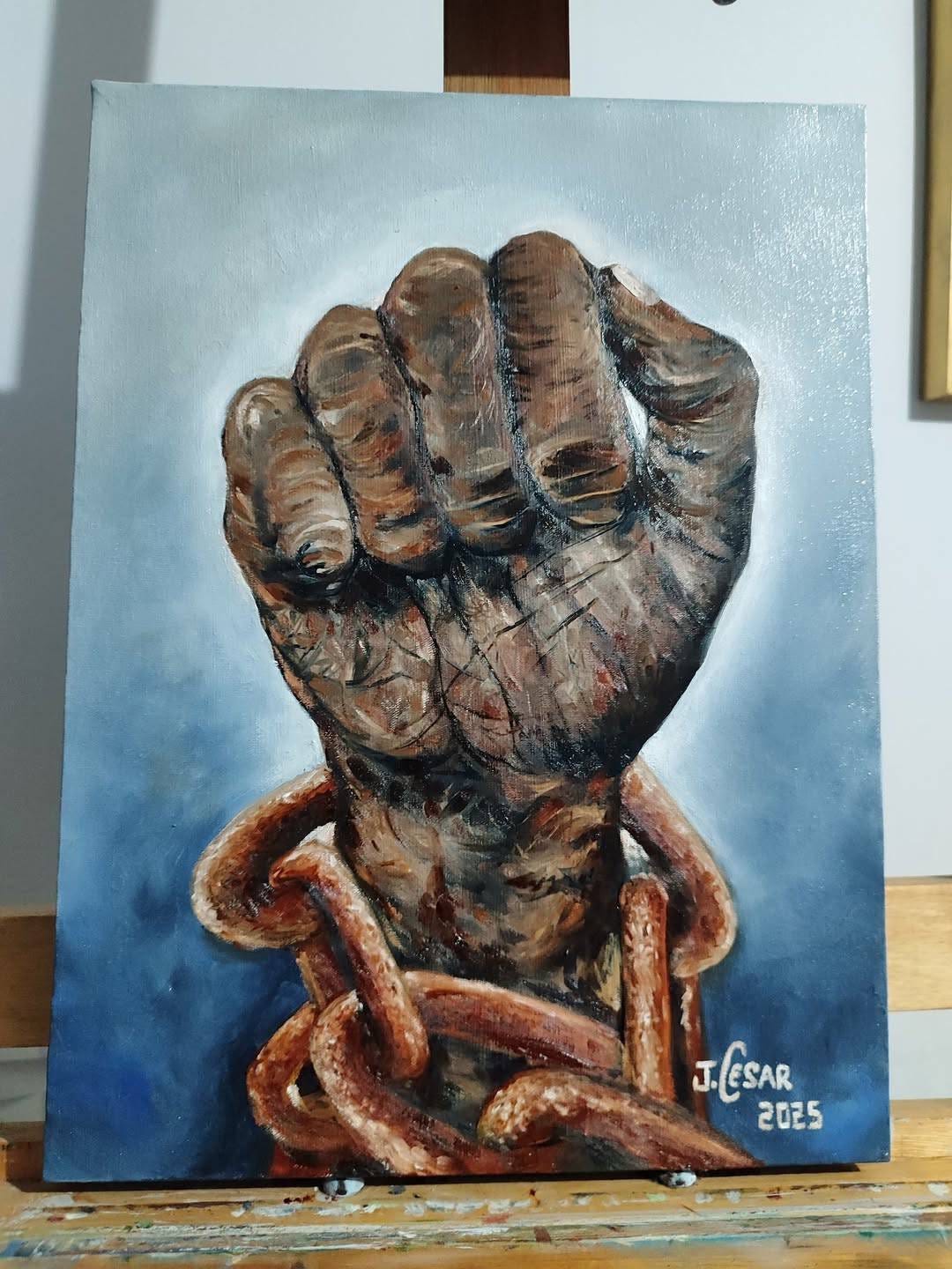 A arte de Júlio Ribeiro transcende a beleza da paisagem para se engajar em temas sociais urgentes. Sua obra doada para o evento do Dia da Consciência Negra, que exibe um punho cerrado acorrentado com cortes, é um poderoso símbolo de luta.