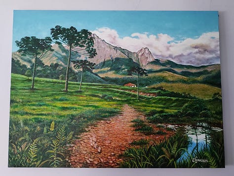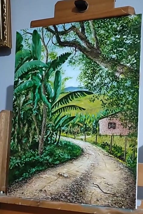 Ribeiro explica a emoção que busca na sua arte figurativa: “Eu gosto que a pessoa chegue diante da tela e fica admirando cada elemento que tem na minha obra, cada composição, cada detalhezinho, uma florzinha, uma árvore afastada, um animal. Eu sou do figurativo mesmo.”