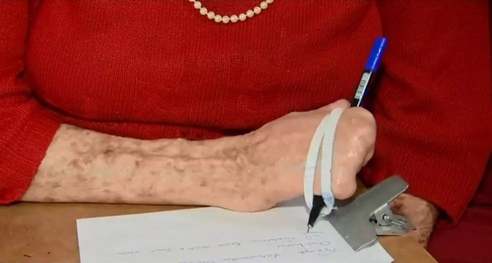 A vida impôs à Léo obstáculos ainda maiores. Com menos de 30 anos, foi diagnosticada com hanseníase, resultando na amputação de uma das mãos. Nove anos depois, um câncer na palma da outra mão levou à segunda amputação. Foi com uma determinação inabalável que ela encontrou uma solução engenhosa: um elástico para apoiar a caneta ou lápis, permitindo que sua paixão pela escrita e pela poesia jamais fosse silenciada.